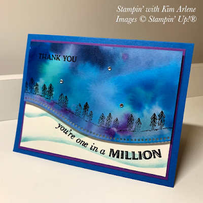 I started with a 5" x 3-1/4" piece of Shimmery White cardstock, and then used the curved eyelet die to cut the bottom edge. The watercolour layer is created with several colours of ink refill drops (Balmy Blue, Highland Heather, Bermuda Bay, Pacific Point, and Night of Navy) added to wet Shimmery White cardstock. Check out one of my recent blog posts (October 5, September 28, 27, or 14) for more details about this method. I used a heat tool to dry this thoroughly, then stamped the trees (from Curvy Christmas) and the "Thank You" (from Blossoms in Bloom) with Memento ink.